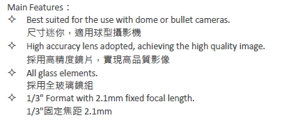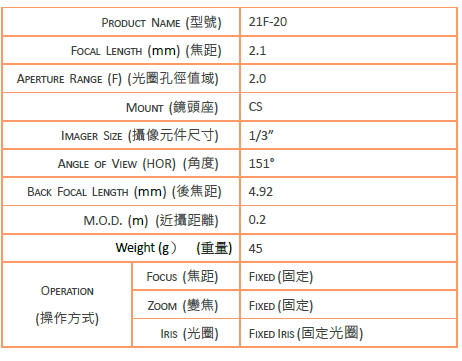21F-20 1/3”定焦 2.1 mm 鏡頭