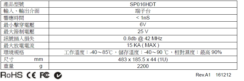 SP016HDT HDCVI/HD-TVI/AHD 突波保護器